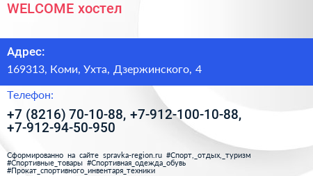 WELCOME, хостел по адресу 169313, Коми, Ухта, Дзержинского, 4 в дальнейшем Организация, размещена в следующих категориях:
