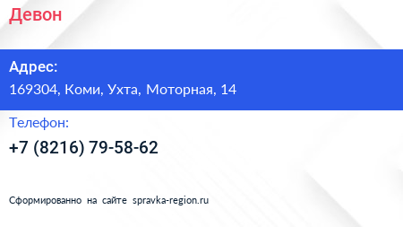 Девон по адресу 169304, Коми, Ухта, Моторная, 14 в дальнейшем Организация, размещена в следующих категориях: