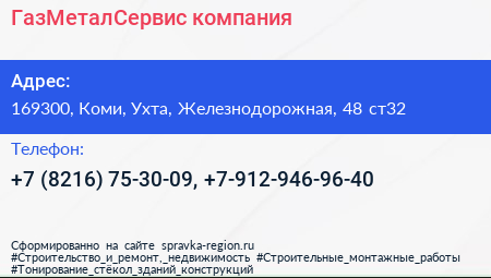 ГазМеталСервис, компания по адресу 169300, Коми, Ухта, Железнодорожная, 48 ст32 в дальнейшем Организация, размещена в следующих категориях: