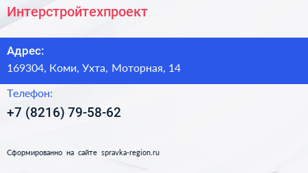 Интерстройтехпроект по адресу 169304, Коми, Ухта, Моторная, 14 в дальнейшем Организация, размещена в следующих категориях: