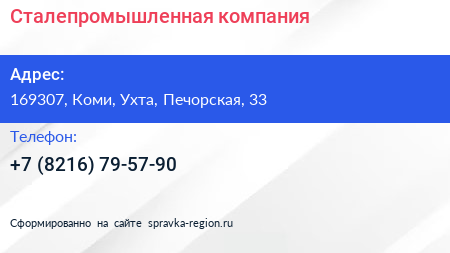Сталепромышленная компания по адресу 169307, Коми, Ухта, Печорская, 33 в дальнейшем Организация, размещена в следующих категориях: