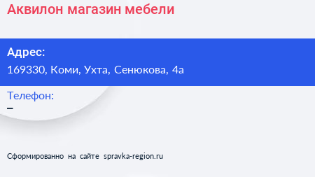 Аквилон, магазин мебели по адресу 169330, Коми, Ухта, Сенюкова, 4а в дальнейшем Организация, размещена в следующих категориях: