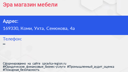 Эра, магазин мебели по адресу 169330, Коми, Ухта, Сенюкова, 4а в дальнейшем Организация, размещена в следующих категориях: