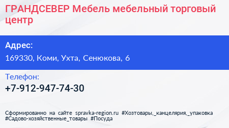 ГРАНДСЕВЕР Мебель, мебельный торговый центр по адресу 169330, Коми, Ухта, Сенюкова, 6 в дальнейшем Организация, размещена в следующих категориях: