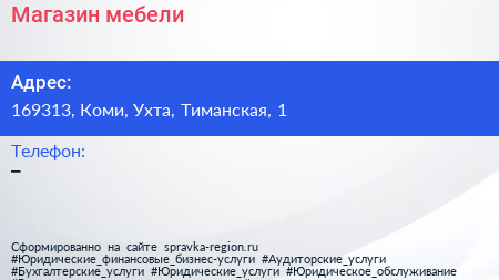 Магазин мебели по адресу 169313, Коми, Ухта, Тиманская, 1 в дальнейшем Организация, размещена в следующих категориях: