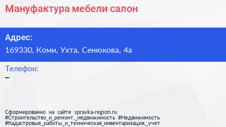 Мануфактура мебели, салон по адресу 169330, Коми, Ухта, Сенюкова, 4а в дальнейшем Организация, размещена в следующих категориях: