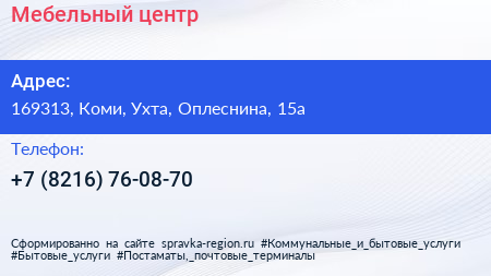 Мебельный центр по адресу 169313, Коми, Ухта, Оплеснина, 15а в дальнейшем Организация, размещена в следующих категориях: