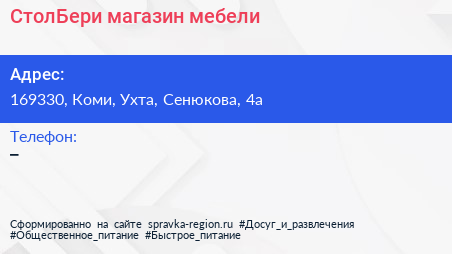 СтолБери, магазин мебели по адресу 169330, Коми, Ухта, Сенюкова, 4а в дальнейшем Организация, размещена в следующих категориях: