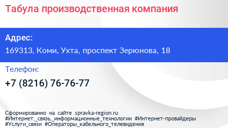 Табула, производственная компания по адресу 169313, Коми, Ухта, проспект Зерюнова, 18 в дальнейшем Организация, размещена в следующих категориях: