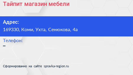 Тайпит, магазин мебели по адресу 169330, Коми, Ухта, Сенюкова, 4а в дальнейшем Организация, размещена в следующих категориях: