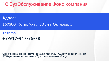 1С БухОбслуживание-Фокс, компания по адресу 169300, Коми, Ухта, 30 лет Октября, 5 в дальнейшем Организация, размещена в следующих категориях: