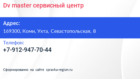 Dv-master, сервисный центр по адресу 169300, Коми, Ухта, Севастопольская, 8 в дальнейшем Организация, размещена в следующих категориях: