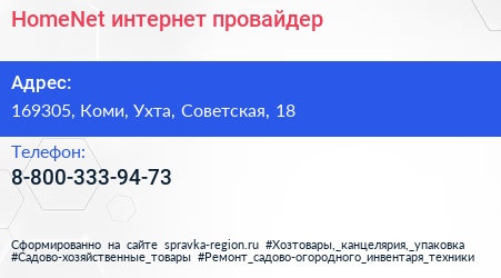 HomeNet, интернет-провайдер по адресу 169305, Коми, Ухта, Советская, 18 в дальнейшем Организация, размещена в следующих категориях:
