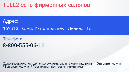 TELE2, сеть фирменных салонов по адресу 169313, Коми, Ухта, проспект Ленина, 16 в дальнейшем Организация, размещена в следующих категориях: