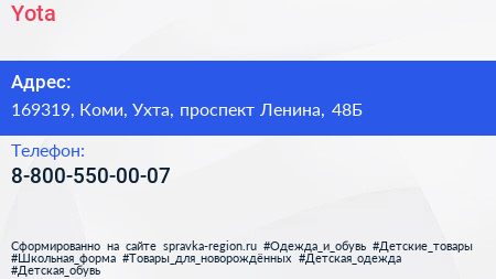 Yota по адресу 169319, Коми, Ухта, проспект Ленина, 48Б в дальнейшем Организация, размещена в следующих категориях: