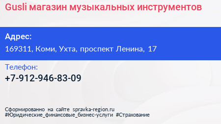 Gusli, магазин музыкальных инструментов по адресу 169311, Коми, Ухта, проспект Ленина, 17 в дальнейшем Организация, размещена в следующих категориях: