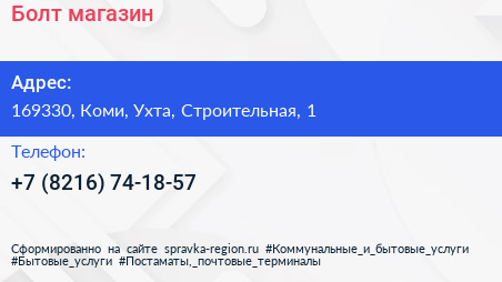 Болт, магазин по адресу 169330, Коми, Ухта, Строительная, 1 в дальнейшем Организация, размещена в следующих категориях:
