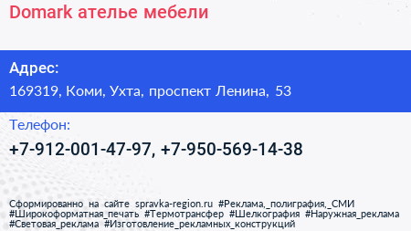 Domark, ателье мебели по адресу 169319, Коми, Ухта, проспект Ленина, 53 в дальнейшем Организация, размещена в следующих категориях: