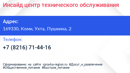 Инсайд, центр технического обслуживания по адресу 169330, Коми, Ухта, Пушкина, 2 в дальнейшем Организация, размещена в следующих категориях: