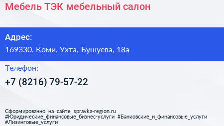 Мебель ТЭК, мебельный салон по адресу 169330, Коми, Ухта, Бушуева, 18а в дальнейшем Организация, размещена в следующих категориях: