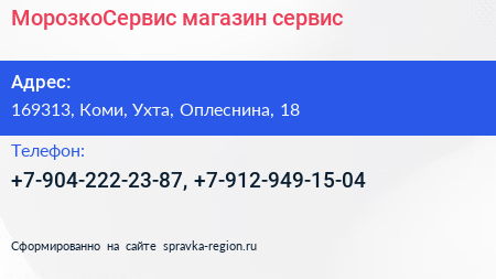 МорозкоСервис, магазин-сервис по адресу 169313, Коми, Ухта, Оплеснина, 18 в дальнейшем Организация, размещена в следующих категориях: