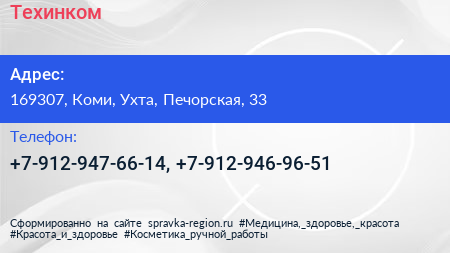 Техинком по адресу 169307, Коми, Ухта, Печорская, 33 в дальнейшем Организация, размещена в следующих категориях: