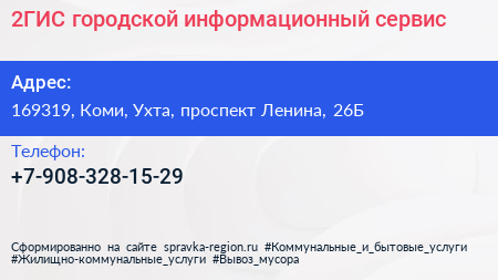 2ГИС, городской информационный сервис по адресу 169319, Коми, Ухта, проспект Ленина, 26Б в дальнейшем Организация, размещена в следующих категориях: