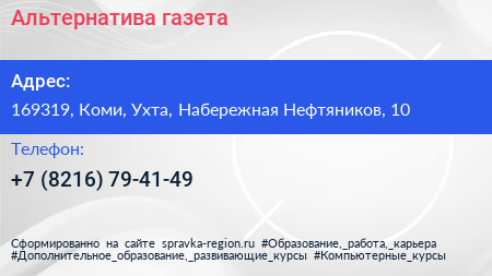 Альтернатива, газета по адресу 169319, Коми, Ухта, Набережная Нефтяников, 10 в дальнейшем Организация, размещена в следующих категориях: