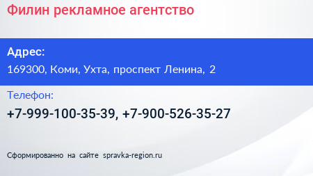 Филин, рекламное агентство по адресу 169300, Коми, Ухта, проспект Ленина, 2 в дальнейшем Организация, размещена в следующих категориях:
