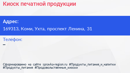Киоск печатной продукции по адресу 169313, Коми, Ухта, проспект Ленина, 31 в дальнейшем Организация, размещена в следующих категориях: