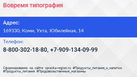 Вовремя, типография по адресу 169330, Коми, Ухта, Юбилейная, 14 в дальнейшем Организация, размещена в следующих категориях: