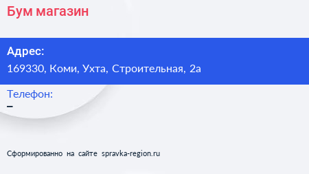 Бум, магазин по адресу 169330, Коми, Ухта, Строительная, 2а в дальнейшем Организация, размещена в следующих категориях: