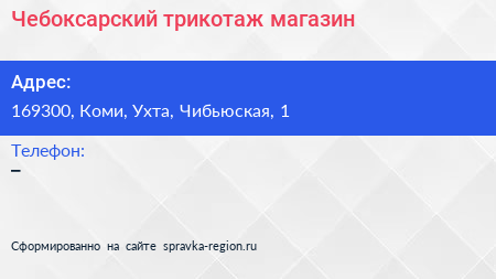 Чебоксарский трикотаж, магазин по адресу 169300, Коми, Ухта, Чибьюская, 1 в дальнейшем Организация, размещена в следующих категориях: