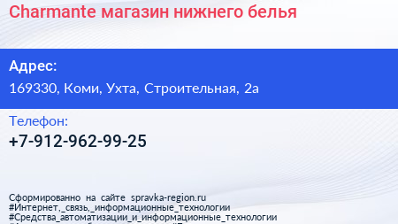 Charmante, магазин нижнего белья по адресу 169330, Коми, Ухта, Строительная, 2а в дальнейшем Организация, размещена в следующих категориях: