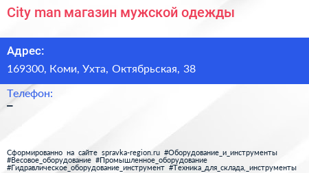 City man, магазин мужской одежды по адресу 169300, Коми, Ухта, Октябрьская, 38 в дальнейшем Организация, размещена в следующих категориях: