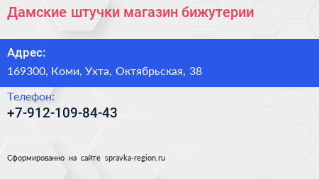 Дамские штучки, магазин бижутерии по адресу 169300, Коми, Ухта, Октябрьская, 38 в дальнейшем Организация, размещена в следующих категориях: