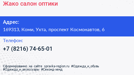 Жако, салон оптики по адресу 169313, Коми, Ухта, проспект Космонавтов, 6 в дальнейшем Организация, размещена в следующих категориях: