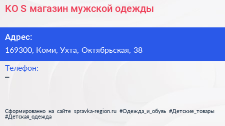 KO`S, магазин мужской одежды по адресу 169300, Коми, Ухта, Октябрьская, 38 в дальнейшем Организация, размещена в следующих категориях: