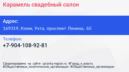 Карамель, свадебный салон по адресу 169319, Коми, Ухта, проспект Ленина, 65 в дальнейшем Организация, размещена в следующих категориях: