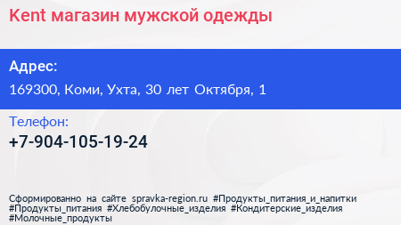 Kent, магазин мужской одежды по адресу 169300, Коми, Ухта, 30 лет Октября, 1 в дальнейшем Организация, размещена в следующих категориях: