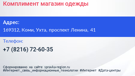 Комплимент, магазин одежды по адресу 169312, Коми, Ухта, проспект Ленина, 41 в дальнейшем Организация, размещена в следующих категориях: