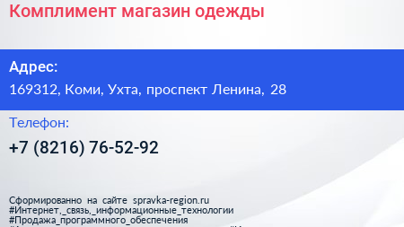 Комплимент, магазин одежды по адресу 169312, Коми, Ухта, проспект Ленина, 28 в дальнейшем Организация, размещена в следующих категориях: