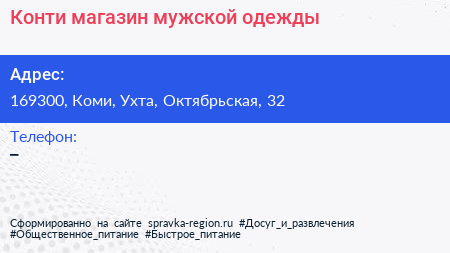 Конти, магазин мужской одежды по адресу 169300, Коми, Ухта, Октябрьская, 32 в дальнейшем Организация, размещена в следующих категориях: