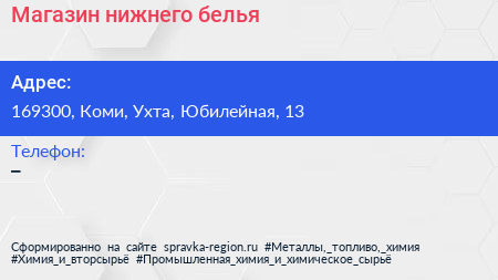 Магазин нижнего белья по адресу 169300, Коми, Ухта, Юбилейная, 13 в дальнейшем Организация, размещена в следующих категориях: