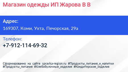 Магазин одежды, ИП Жарова В.В. по адресу 169307, Коми, Ухта, Печорская, 29а в дальнейшем Организация, размещена в следующих категориях: