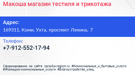 Макоша, магазин тестиля и трикотажа по адресу 169311, Коми, Ухта, проспект Ленина, 7 в дальнейшем Организация, размещена в следующих категориях: