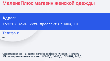 МаленаПлюс, магазин женской одежды по адресу 169313, Коми, Ухта, проспект Ленина, 10 в дальнейшем Организация, размещена в следующих категориях: