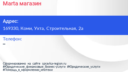 Marta, магазин по адресу 169330, Коми, Ухта, Строительная, 2а в дальнейшем Организация, размещена в следующих категориях: