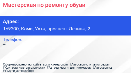 Мастерская по ремонту обуви по адресу 169300, Коми, Ухта, проспект Ленина, 2 в дальнейшем Организация, размещена в следующих категориях: