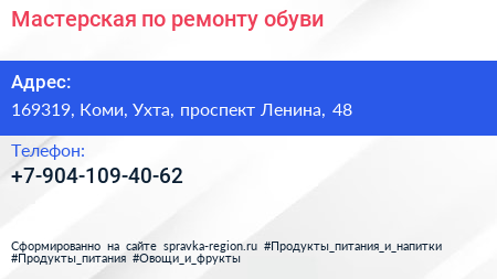 Мастерская по ремонту обуви по адресу 169319, Коми, Ухта, проспект Ленина, 48 в дальнейшем Организация, размещена в следующих категориях: